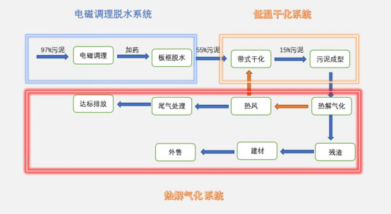 污泥气化技术是利用有机质在高温贫氧条件下裂解的性质,将污泥烘干后投入密闭蓄热气化炉内,经过900-1100℃的高温贫氧气化环境,使污泥中的有机成分裂解挥发,转化为以一氧化碳、氢气、烷类气体为主的可燃气体,污泥中的无机物以残渣形式排出
